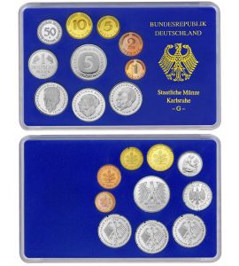 je 1x 5 DM CuNi, 1x 2 DM Adenauer, 1x 2 DM Heuss, 1x 1 DM, 1x 50 Pfennig, 1x 10 Pfennig, 1x 5 Pfennig, 1x 2 Pfennig, 1x 1 Pfennig