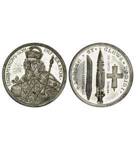 Brustbild Kaiser Sigismund in Ornat nach halblinks / Spitze der heiligen Lanze, ein Stück der Krippe und Kreuz aus dem Holz des heiligen Kreuzes.